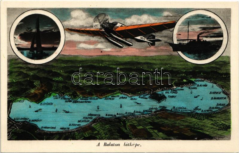 Balaton, térkép, gőzhajó, vitorlás és hidroplán https://www.darabanth.com/hu/434-Gyorsarveres/434.0/Kepeslapok/Magyarorszag~2000004/Balaton-terkep-gozhajo-vitorlas-es-hidroplan~II2806528