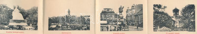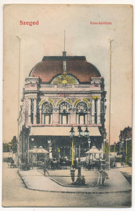 Leírás: Szeged, Kass kávéház. Leporellolap belül gőzfürdő, Erzsébet királyné (Sissi) szobor, vigadó, vasútállomás (fl)
