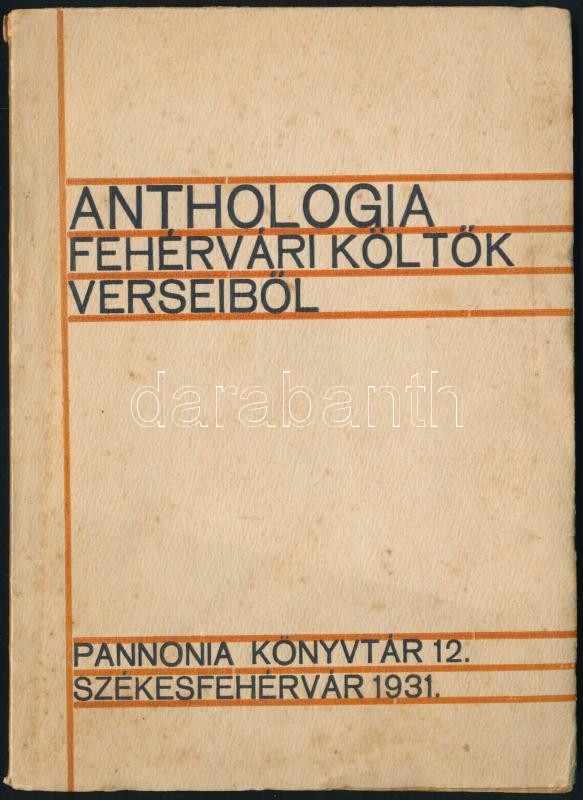 Anthologia fehérvári költők verseiből. Székesfehérvár 1931. Pannónia 9... https://www.darabanth.com/hu/434-Gyorsarveres/434.0/Konyvek/Konyvek-Egyeb-ritkasagok~1000021/Anthologia-fehervari-koltok-verseibol-Szekesfehervar-1931-Pannonia-96p-Kiadoi-papirko~II2808335