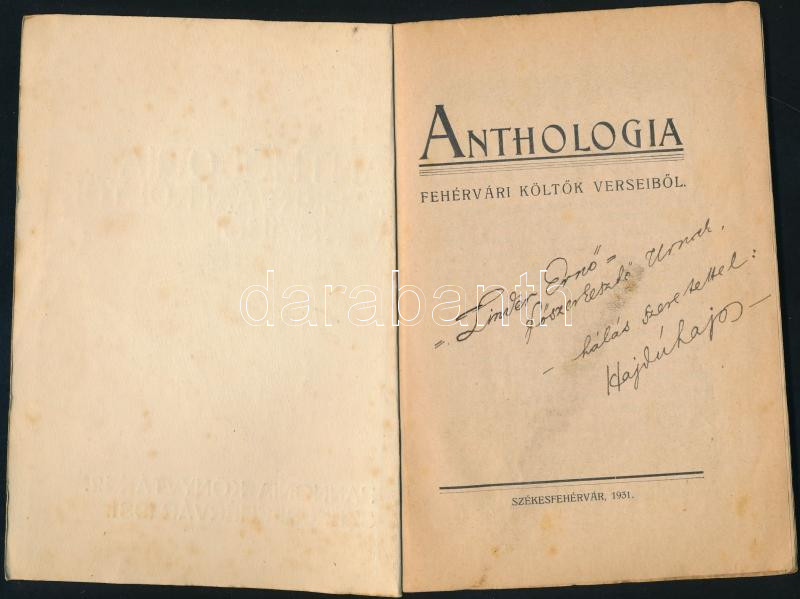 Leírás: Anthologia fehérvári költők verseiből. Székesfehérvár 1931. Pannónia 96p. Kiadói papírkötésben DEDIKÁLT példány