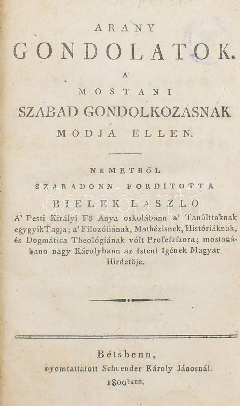 Bielek László: Arany gondolatok. A mostani szabad gondolkozásnak módja ellen. Németből szabadon forditotta - -. Bétsbenn, 1800, Schuender Károly János, 8 + XVI + 590 p. Első magyar nyelvű kiadás. Korabeli aranyozott gerincű bordázott egészbőr-kötés, a borítón kopásnyomokkal, a gerincen apró sérüléssel.