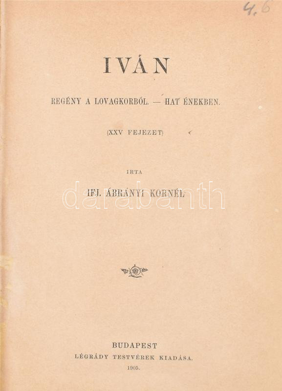 Ifj. Ábrányi Kornél: Iván. Regény a lovagkorból. Hat énekben. (XXV. fe... https://www.darabanth.com/hu/434-Gyorsarveres/434.0/Konyvek/Konyvek-Egyeb-ritkasagok~1000021/Ifj-Abranyi-Kornel-Ivan-Regeny-a-lovagkorbol-Hat-enekben-XXV-fejezet-Bp-1905-Leg~II2803642