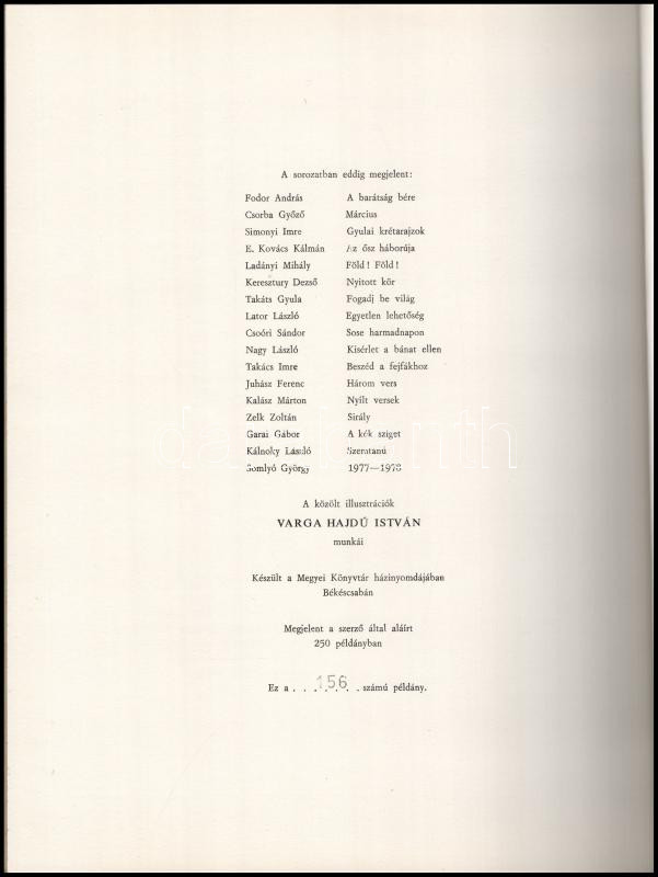 Számozott (156./250) és a szerző, Jékely Zoltán (1913-1982) költő által aláírt példány.