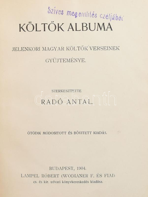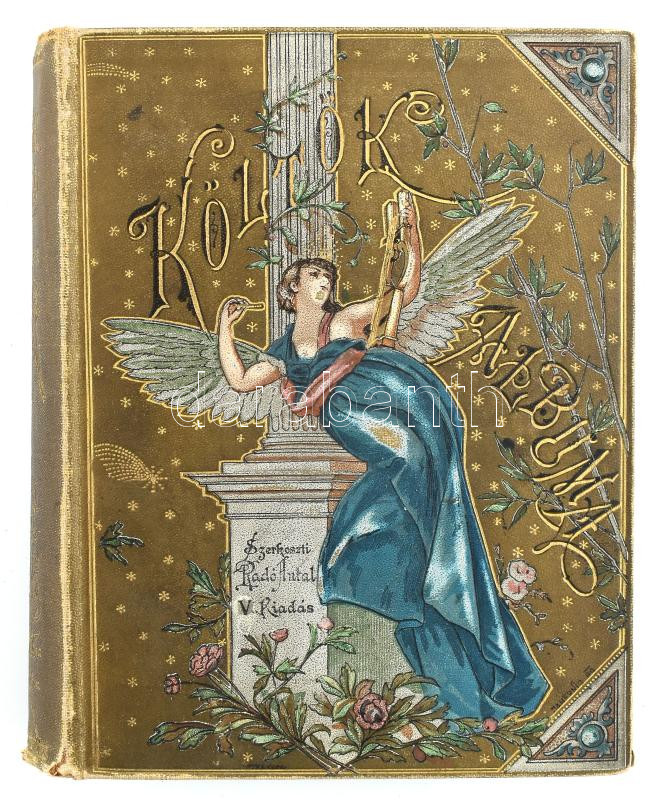 Költők albuma. Jelenkori magyar költők verseinek gyűjteménye. Szerk.: Radó Antal. Bp., 1904, Lampel R. (Wodianer F. és Fiai), VIII+(2)+414 p. Ötödik kiadás. Kiadói illusztrált, aranyozott, festett egészvászon-kötés, Gottermayer-kötés, aranyozott lapélekkel, kissé sérült borítóval, a címlapon "Szíves megemlítés czéljából" bélyegzéssel.