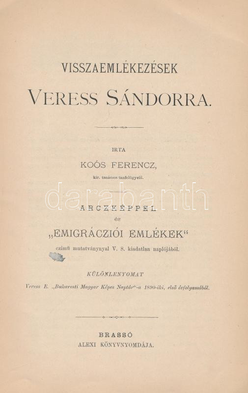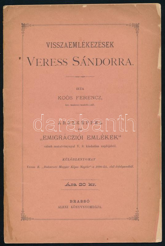 Koós Ferenc: Visszaemlékezések Veress Sándorra. Arczképpel és "Emigrácziói Emlékek" czímű mutatvánnyal V. S. kiadatlan naplójából. Különlenyomat Veress E. "Bukaresti Magyar Képes Naptár"-a 1890-iki első évfolyamából. Brassó, 1890., Alexi Könyvnyomdája, 1 t.+16 p. Kiadói papírkötés, szakadozott borítóval.