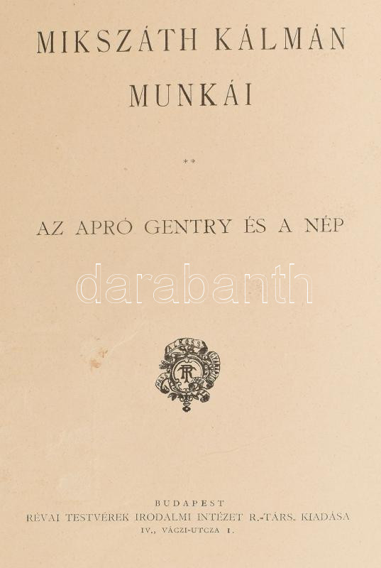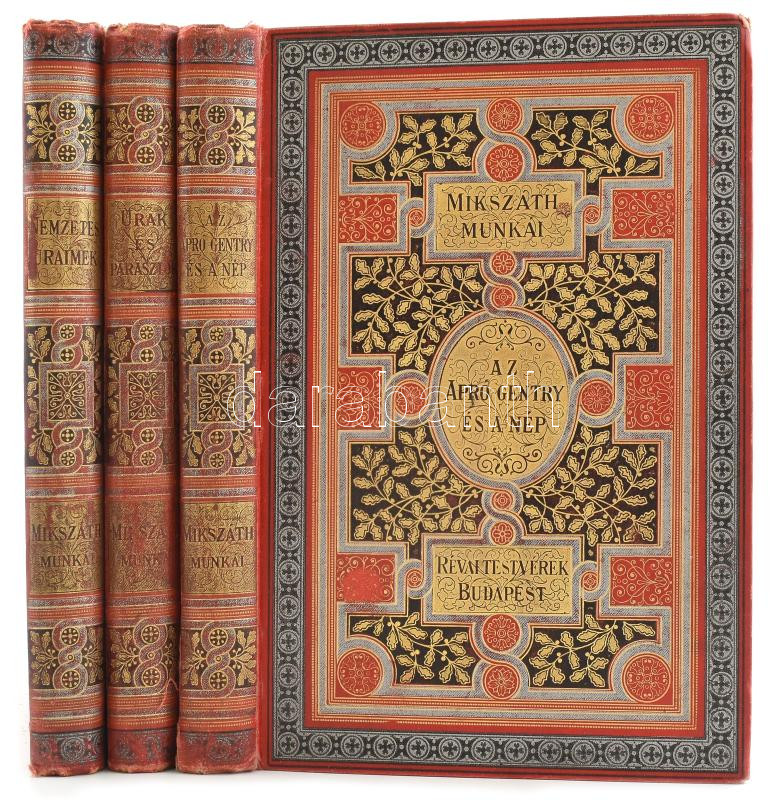 Mikszáth Kálmán 3 műve: Nemzetes uraimék. Bp.,én., Révai,(Pallas-ny.), 4+226 p. Kiadói aranyozott, festett egészvászon-kötés, Gottermayer-kötés, festett lapélekkel, kopott, kissé foltos borítóval, hiányzó címlappal.; Urak és parasztok. Bp.,én., Révai,(Pallas-ny.), 6+224 p. Kiadói aranyozott, festett egészvászon-kötés, Gottermayer-kötés, festett lapélekkel, kopott, kissé foltos borítóval, hiányzó címlappal, és hiányzó hátsó szennylappal.; Apró gentry és a nép. Bp.,én., Révai,(Pallas-ny.), VIII+240 p. Kiadói aranyozott, festett egészvászon-kötés, Gottermayer-kötés, festett lapélekkel, kopott, kissé foltos borítóval, a gerincen sérülésnyommal, hiányzó címlappal (IV/V.), az utolsó 2-3 lap hiányzik.;