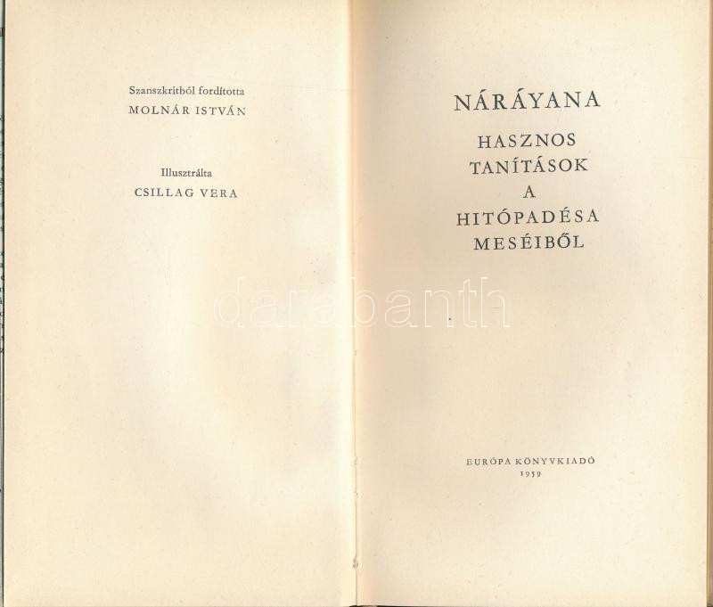 Leírás: Náráyana. Hasznos tanítások a Hitópadésa meséiből. Ford.: Molnár István. Bp., 1959., Európa. Csillag Vera illusztrációival. Kiadói egészvászon-kötés, kiadói nylon védőboríótóban.