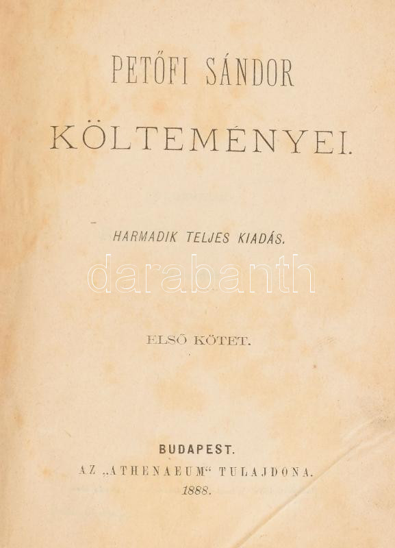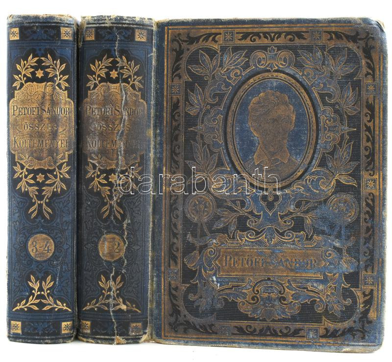 Petőfi Sándor költeményei I-IV. (Két kötetben.) Bp., 1888, Athenaeum. 442+2+405+XII; 427+X+375+VIII p. Harmadik teljes kiadás. Kiadói aranyozott, festett, egészvászon-kötés, aranyozott lapélekkel, kopott borítókkal, a II. kötet gerince javított, az I. kötetből a címkép hiányzik és 1 lap kijár.