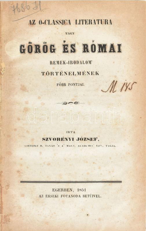 Svorényi József: Az ó-classica literatura vagy görög és római remek-irodalom' történelmének főbb pontjai. Eger, 1851., Érseki Főtanoda, IV+7-346+III+2 p. Átkötött félvászon-kötés, kopott borítóval, foltos címlappal, kissé foltos lapokkal, egy hiányzó lappal (5/6.), néhány aláhúzással, a címlapon bejegyzésekkel.