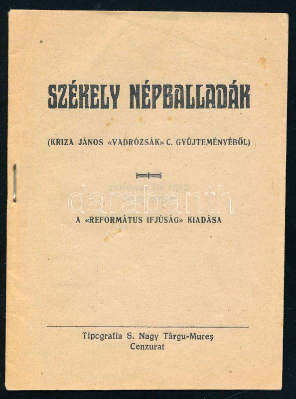 Székely népballadák. (Kriza János "Vadrózsák" c. gyűjteményéből.) Sajtó alá rendezte: Egey Jenő. Targu-Mures/Marosvásárhely, én., Református Ifjúság,(Tipografia S. Nagy), 16 p. Kiadói papírkötés.