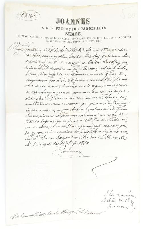 Leírás: 1874 Simor János esztergomi érsek autográf aláírással ellátott latin nyelvű okmánya, érseki szárazpecséttel