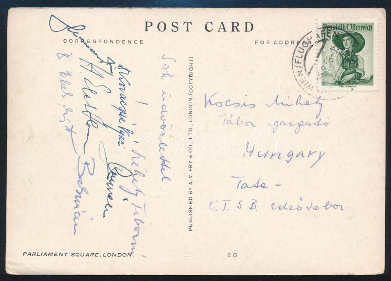 Leírás: 1952 Bécs, Elek Ilona (1907-1988) olimpiai- és világbajnok tőrvívó, és más vívók autográf aláírása hazaküldött képeslapon