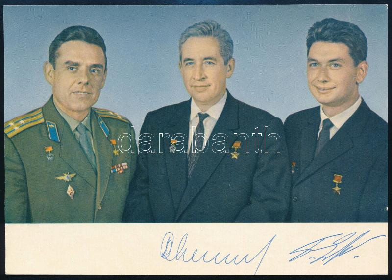 Konsztantyin Feoktyisztov (1926-2009) és Borisz Jegorov (1937-1994) orosz űrhajósok aláírásai képeslapon / Signatures of Konstantin Feoktistov (1926-2009) and Boris Yegorov (1937-1994) Russian astronauts on postcard 15x10 cm