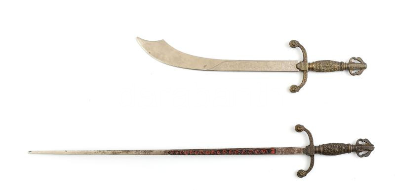 Leírás: 2 db olasz dísztőr / kard, fém, jelzett, az egyik rozsdafoltos, h: 37-54 cm