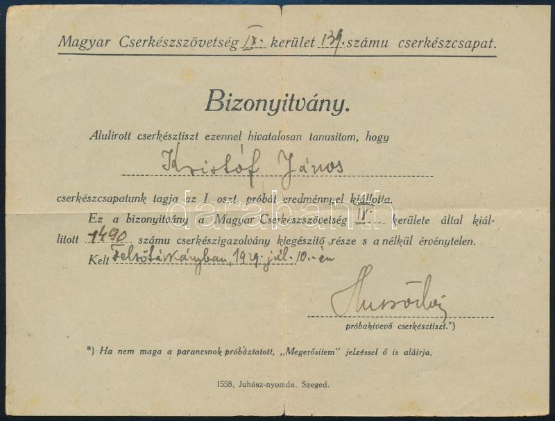 Leírás: 1929 Magyar Cserkészszövetség IX. kerület 139. sz. cserkészcsapat által kiállított bizonyítvány I. oszt. próba teljesítéséről