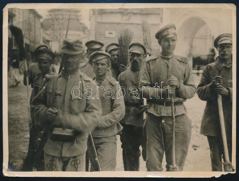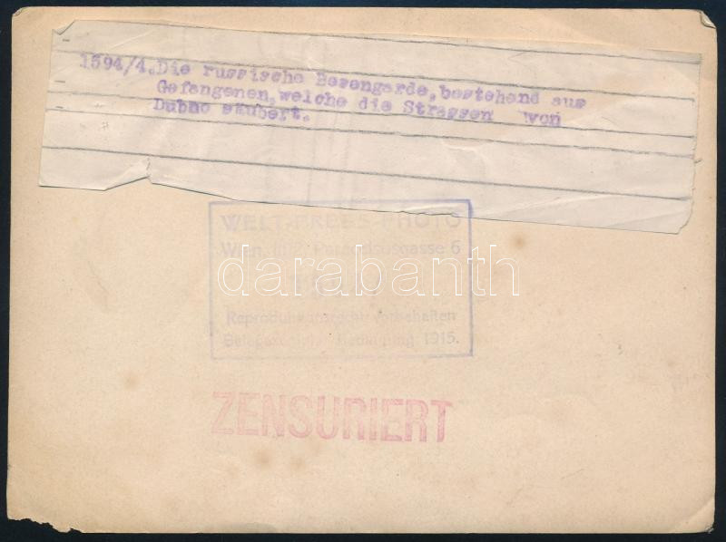 1915 Orosz hadifoglyokból álló utcaseprő-alakulat Dubno egyik utcáján, I. világháborús sajtófotó, hátoldalán feliratozott, pecséttel jelzett (Welt-Press-Photo Wien), cenzori bélyegzéssel, 15,5x12 cm