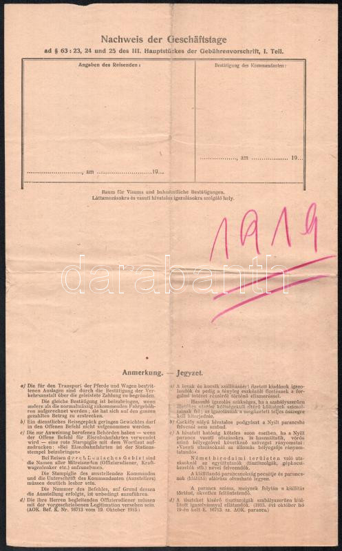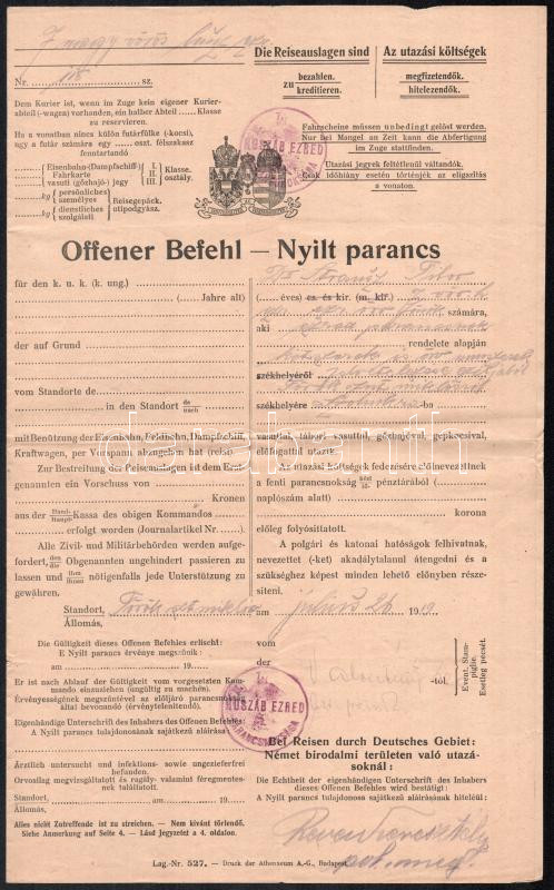 1919.VII.26. Törökszentmiklós, a 7. vörös huszárezred parancsnoksága által kiadott nyílt parancs, Dr. Strausz Tibor, az ezred orvosfőnöke számára, kötszerek és orvosi műszerek felvételezése céljából Törökszentmiklósról Szolnokra való utazásról. (A Monarchia idejéből származó formanyomtatvány a Tanácsköztársaság alatt került felhasználásra, az ezred bélyegzőjéből a "cs. és kir." részt eltávolították). Aláírással, bélyegzőkkel.
