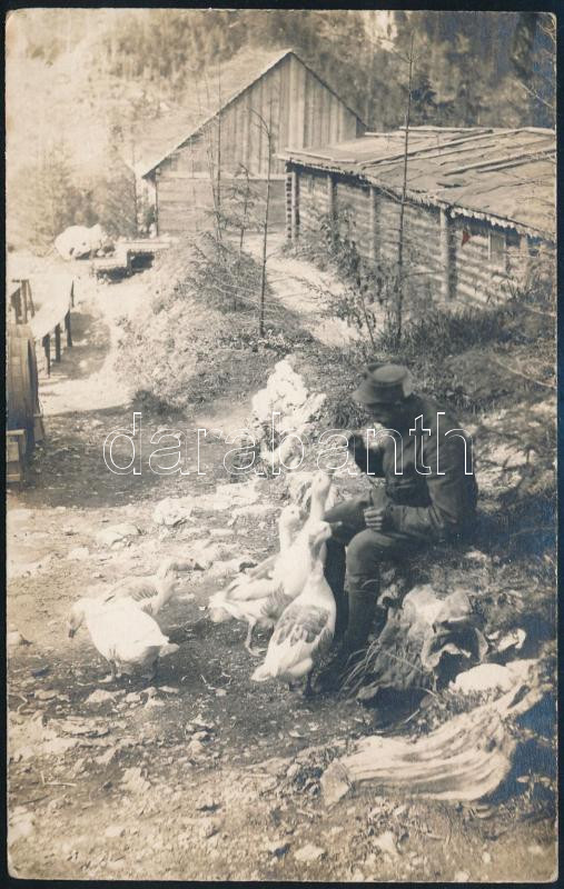 cca 1917 A cs. és kir. 105. gyalogezred (K.u.K. Infanterie-Regiment 105.) katonája libákat etet, tábori életkép a Keleti-Kárpátokban (Erdély, Hagymás-hegység, Békás-szoros közelében), I. világháborús fotólap, hátoldalán ajándékozási sorokkal feliratozva, 14x9 cm
