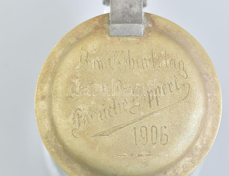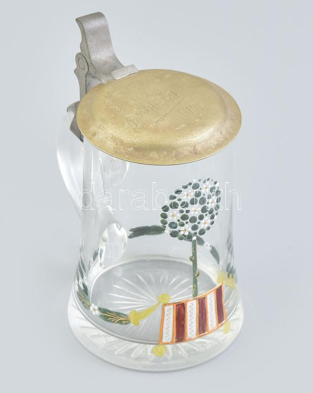 Leírás: 1906 Antik söröskorsó, kézzel festett üveg, fém fedéllel, tetején német nyelvű vésett felirattal, m: 12 cm