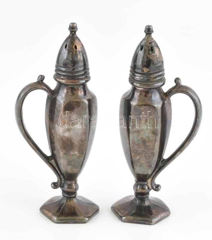 Leírás: Ezüstözött fém só- és borszóró, 2 db, jelzett, kopásokkal, m: 12 cm