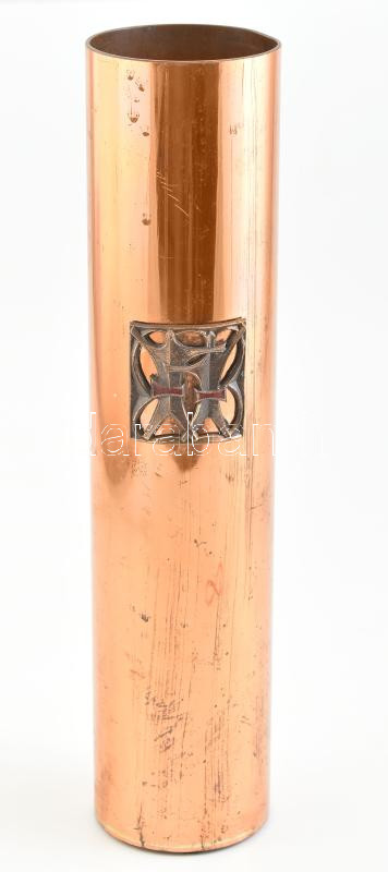 Leírás: Jelzés nélkül: Retró iparművészeti díszváza. Vörösréz színű nikkellel bevont bronz, palástján tűzzománcozott bronz relief díszítmény. Kopásokkal, szájperemén minimális deformálódással. m: 35 cm