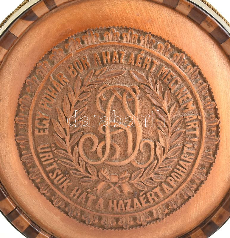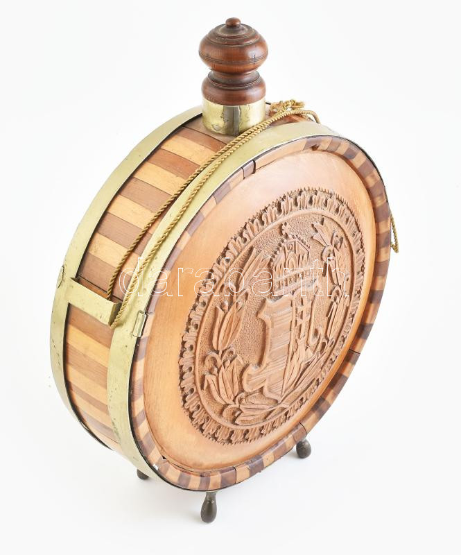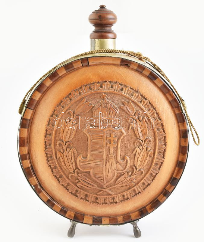 Régi nagyméretű, fémveretes, intarziás faragott fa kulacs, koronás magyar címerrel, másik oldalán monogrammal és verses felirattal: "Egy pohár bor a hazáért meg nem árt! Ürítsük hát a hazáért a pohárt!" Korának megfelelő állapotban, m: 35 cm