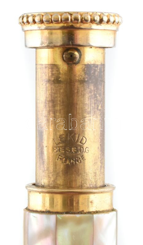 Leírás: Régi parfümszóró, réz, gyöngyház borítással, jelzett: LeKid France, h: 6,5 cm