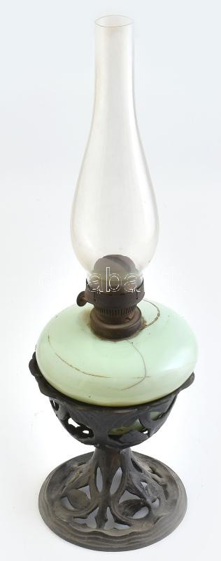 Leírás: Régi petróleumlámpa, cilinderrel, rozsdafoltos fém szerelékkel, kis csorbákkal m: 48 cm