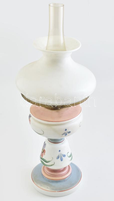 Leírás: Régi petróleumlámpa, üveg testtel, cilinderrel, rozsdafoltos fém szerelékkel, kis csorbákkal m: 53 cm