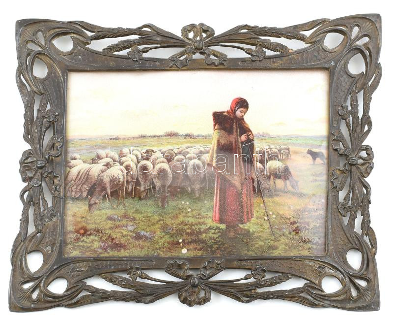 Leírás: Szecessziós fém keret, benne litho zsánerképpel. 19x13 cm Külső méret 26x21 cm