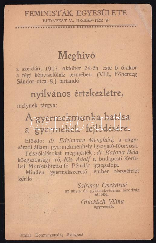 Leírás: 1917 Meghívó gyermekmunkáról szóló értekezletre