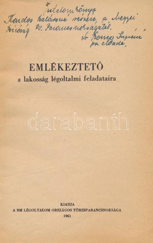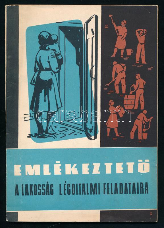 1961 Emlékeztető a lakosság légoltalmi feladataira. Kiadja a BM Légoltalom Országos Törzsparancsnoksága. Bp., 1961, Zrínyi-ny., 96 p. Fekete-fehér ábrákkal illusztrálva. Kiadói papírkötés, ajándékozási bejegyzéssel.