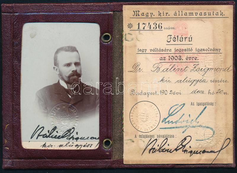 1903 Dr. Bálint Zsigmond alügyész fényképes MÁV igazolványa, aláírások... https://www.darabanth.com/hu/434-Gyorsarveres/434.0/Mutargy-papirregiseg-egyeb/Okmanyok~500020/1903-Dr-Balint-Zsigmond-alugyesz-fenykepes-MAV-igazolvanya-alairasokkal-szarazpecsete~II2808085