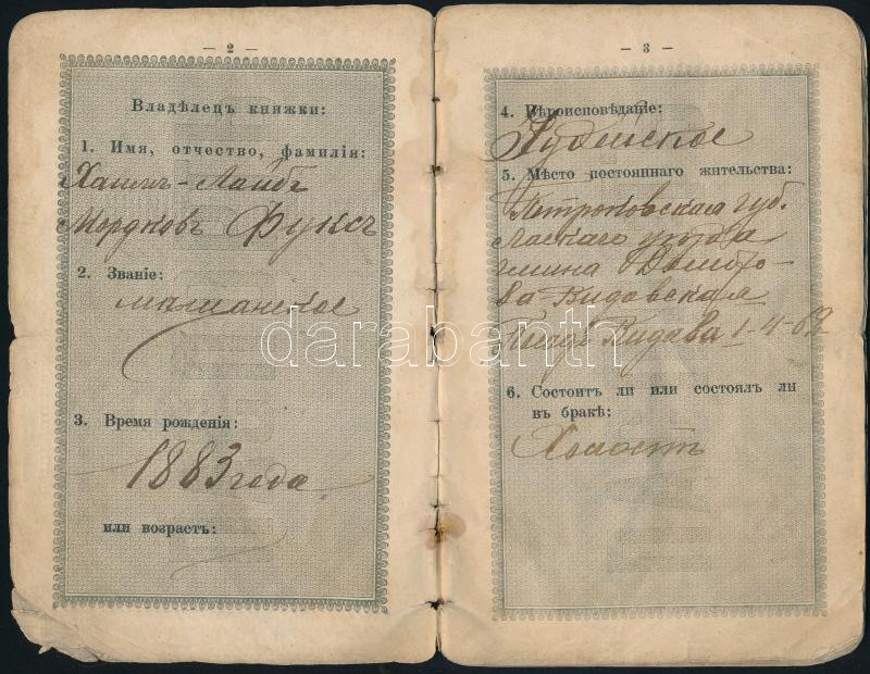 1906 Orosz útlevél, megviselt állapotban https://www.darabanth.com/hu/434-Gyorsarveres/434.0/Mutargy-papirregiseg-egyeb/Okmanyok~500020/1906-Orosz-utlevel-megviselt-allapotban~II2808571