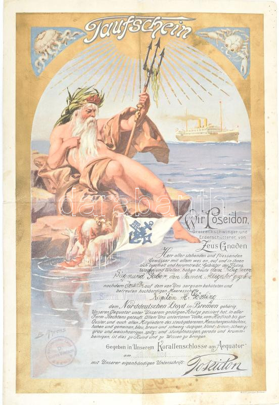 Leírás: 1924 A brémai "Norddeutschen Lloyd" egyenlítő áthajózásáért járó díszes oklevele (taufschein), hajtott, 42x28 cm