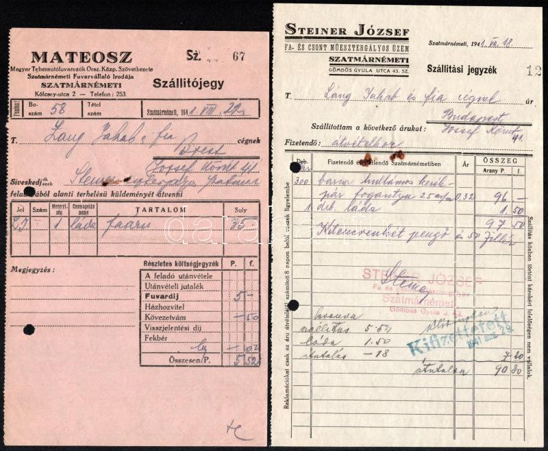Leírás: 1941 Szatmárnémeti, 2 db szállítólevél (MATEOSZ és Steiner József fa- és csont műesztergályos üzem), fejléces papíron, kissé sérült