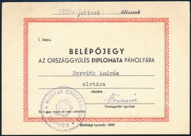 1956 Belépő az Országgyűlés diplomata páholyába, 10x14,5 cm https://www.darabanth.com/hu/434-Gyorsarveres/434.0/Mutargy-papirregiseg-egyeb/Okmanyok~500020/1956-Belepo-az-Orszaggyules-diplomata-paholyaba-10x14-5-cm~II2807413
