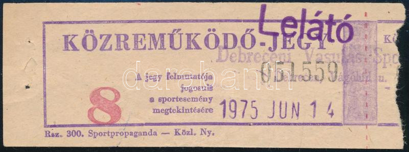Leírás: 1975 Debreceni Vasutas Sport Club közreműködő jegy