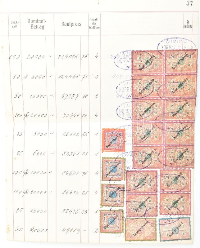 Leírás: Bécs 1920 Értékpapír forgalmi napló lapja 714.60K értékű értékpapír forgalmi adóbélyeggel