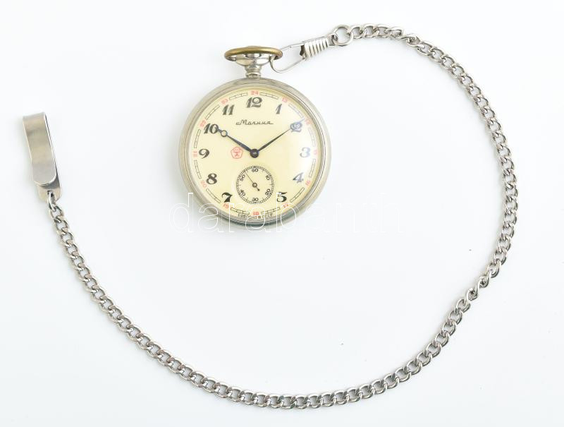 Leírás: Molnia zsebóra, másodpercmutatóval, óralánccal, működik, d: 50 mm
