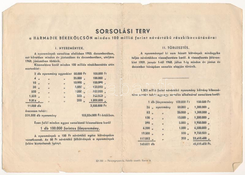 Leírás: 1952. "Harmadik Békekölcsön" sorsjegy 50Ft-ról, szárazpecséttel T:III,III-
