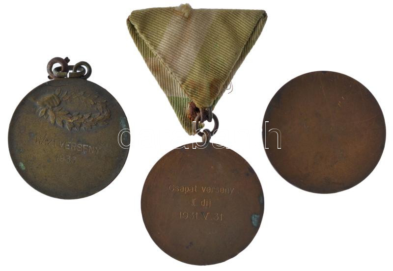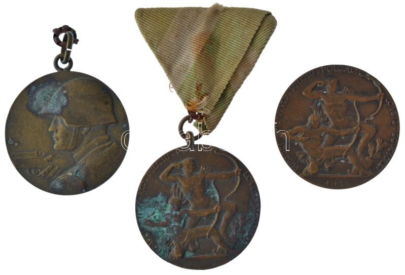 Madarassy Walter (1909-1994) 1934. "Budapest IV. Kerületi Bulcsu Polgári Lövész Egyesület" bronz díjérem (30mm) + ~1930. "Budapest IV. Kerületi Bulcsu Polgári Lövész Egyesület" bronz díjérem mellszalagon (30mm) + 1933. kétoldalas bronz lövészsport érem "Huguenin" gyártói jelzéssel, "Házi verseny 1933" gravírozással T:2,2- korr.
