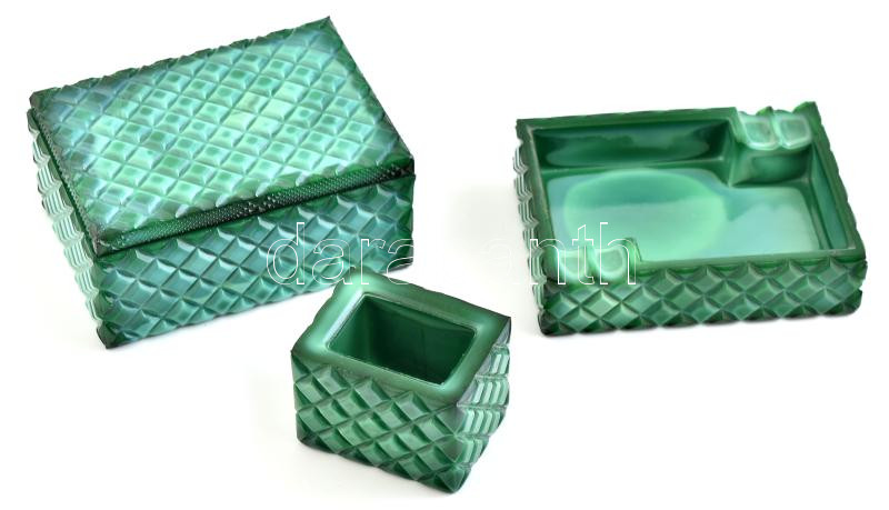Leírás: Cseh Malachit üveg, dohányzó szett, Ingrid kollekció, öntött, XX. század, korának megfelelő állapotban. 12x9x5,5 , 12x9x3 , 6,5x5x4,5 cm