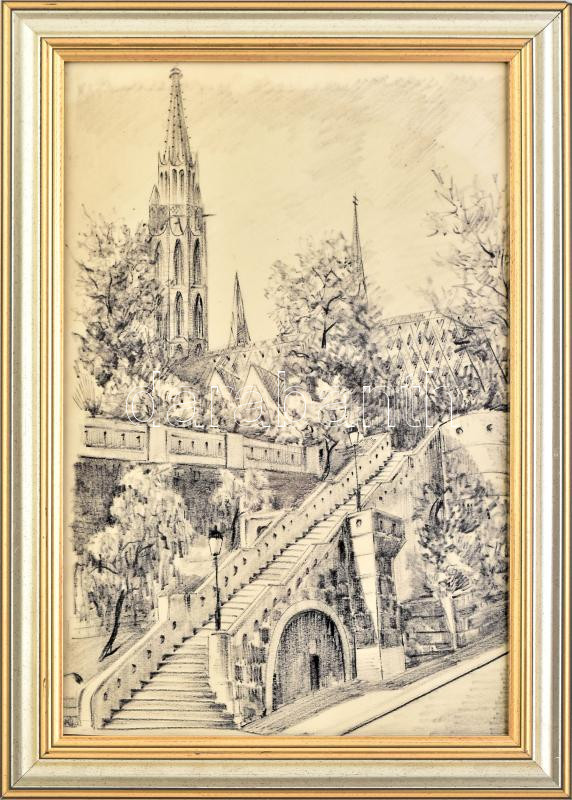 Leírás: Jelzés nélkül: Mátyás-templom, Budapest. Szén, papír. Dekoratív, üvegezett fakeretben. 46x30 cm.