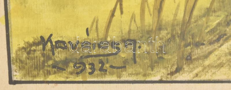 Leírás: Kovács A jelzéssel: Alföldi tanya, 1932. Akvarell, papír. Dekoratív, üvegezett, kissé kopott fakeretben, 13,5x20,5 cm