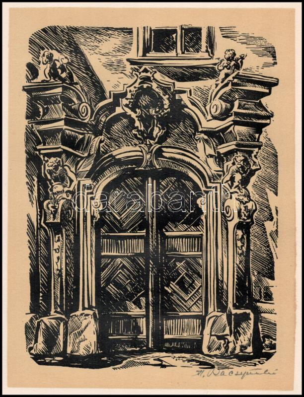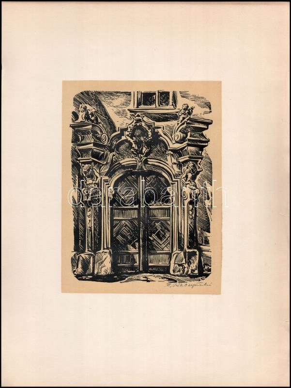 Leírás: Olvashatatlan jelzéssel: Krakkói részlet, fametszet, papír, 22×16,5 cm