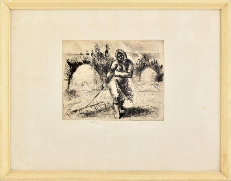 Leírás: Iván Szilárd (1912-1988): Szénagyűjtő. Rézkarc, papír, jelzett, számozott (21/100), lapszéli apró foltokkal, üvegezett fakeretben, 19x23,5 cm