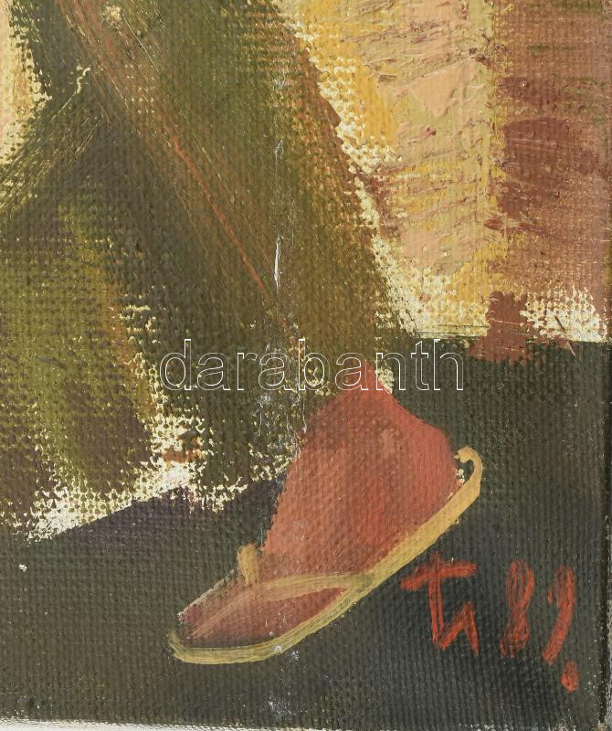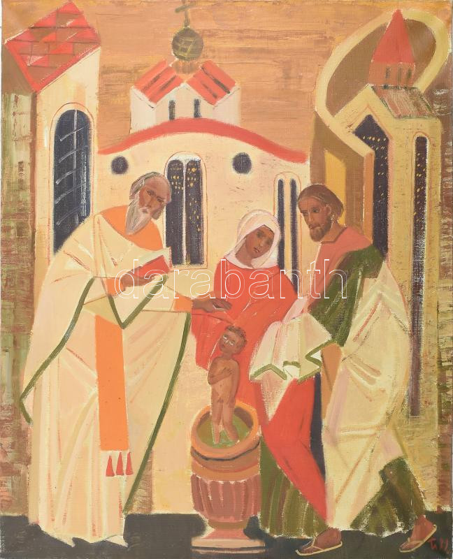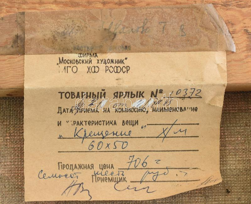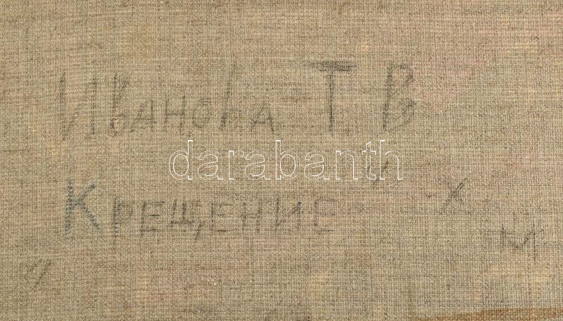 Ivanova, T. V. (?-), orosz vagy szovjet festő: Keresztelő. Olaj, vászon, jelezve jobbra lent, hátoldalán autográf felirattal és címkén feliratozott, 60×50 cm / Ivanova, T. V. (?-), Soviet or Russian painter: Christening. Oil on canvas, signed lower right, with autograph description and label on the reverse. 60x50 cm