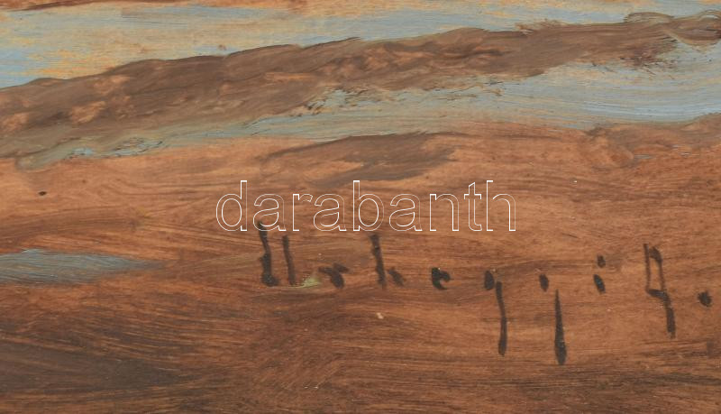 Leírás: Urhegyi Alajos (1871-?): Balatonparti vitorlás. Olaj, karton, jelzett. Dekoratív, kissé sérült fakeretben, 34×50 cm.