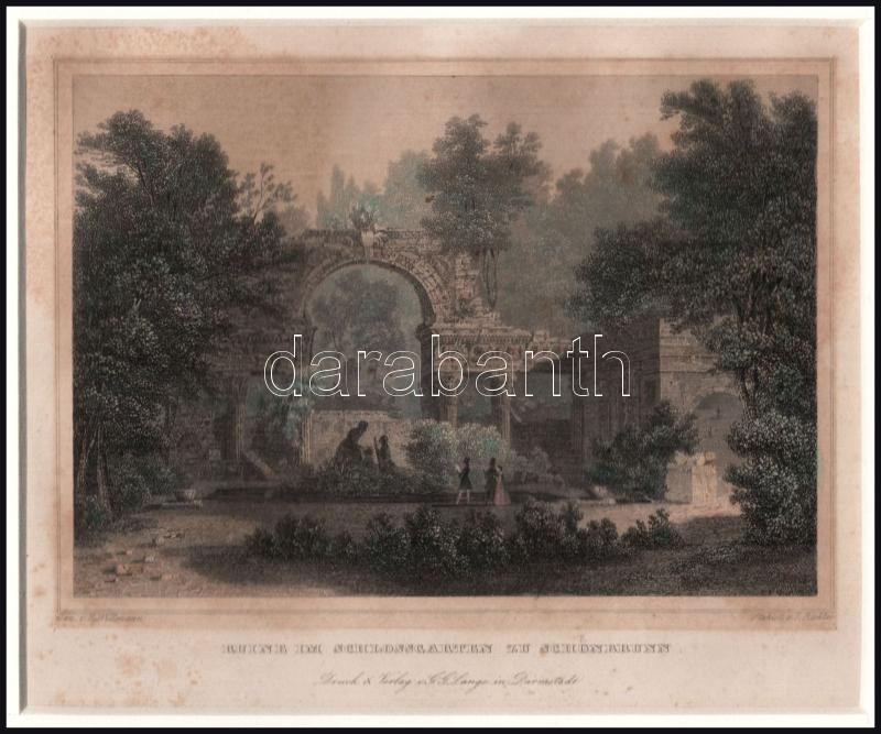 Eduard Willmann (1820-1877) után, J. Richter metszése: Romok a schönbrunni kastély parkjában (Ruine im Schlossgarten zu Schönbrunn). Színezett acélmetszet, papír, jelzett a metszeten, kissé foltos, paszpartuban, 11x15 cm